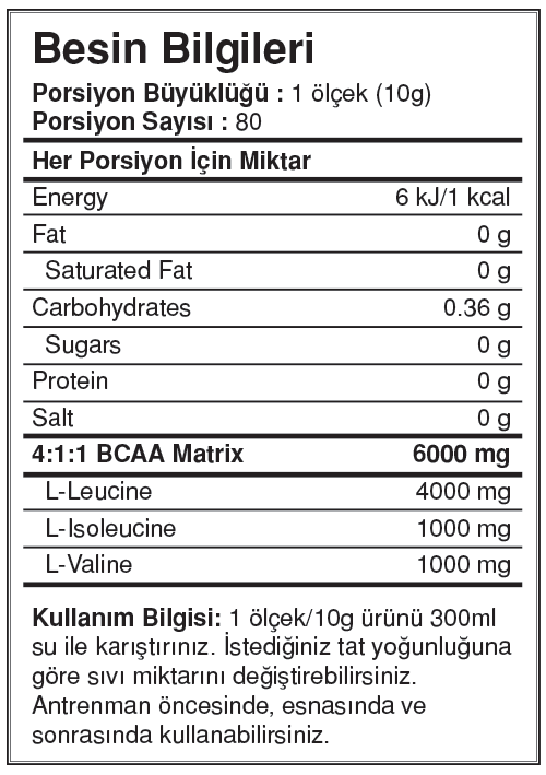 Lösin oranı çok yüksektir. Her servisinde 4000 mg lösin amino asidi bulunur. Lösin amino asidi, BCAA’ları oluşturan üç amino asit içerisinde anabolik etkiye sahip, yani kas parçalanmasını azaltan en önemli amino asittir.