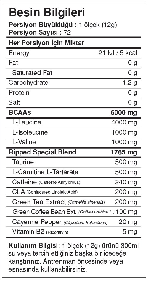 Bigjoy BCAAPro Ripped, her porsiyonunda 4:1:1 BCAA oranına sahip 6000 mg BCAA sunar.