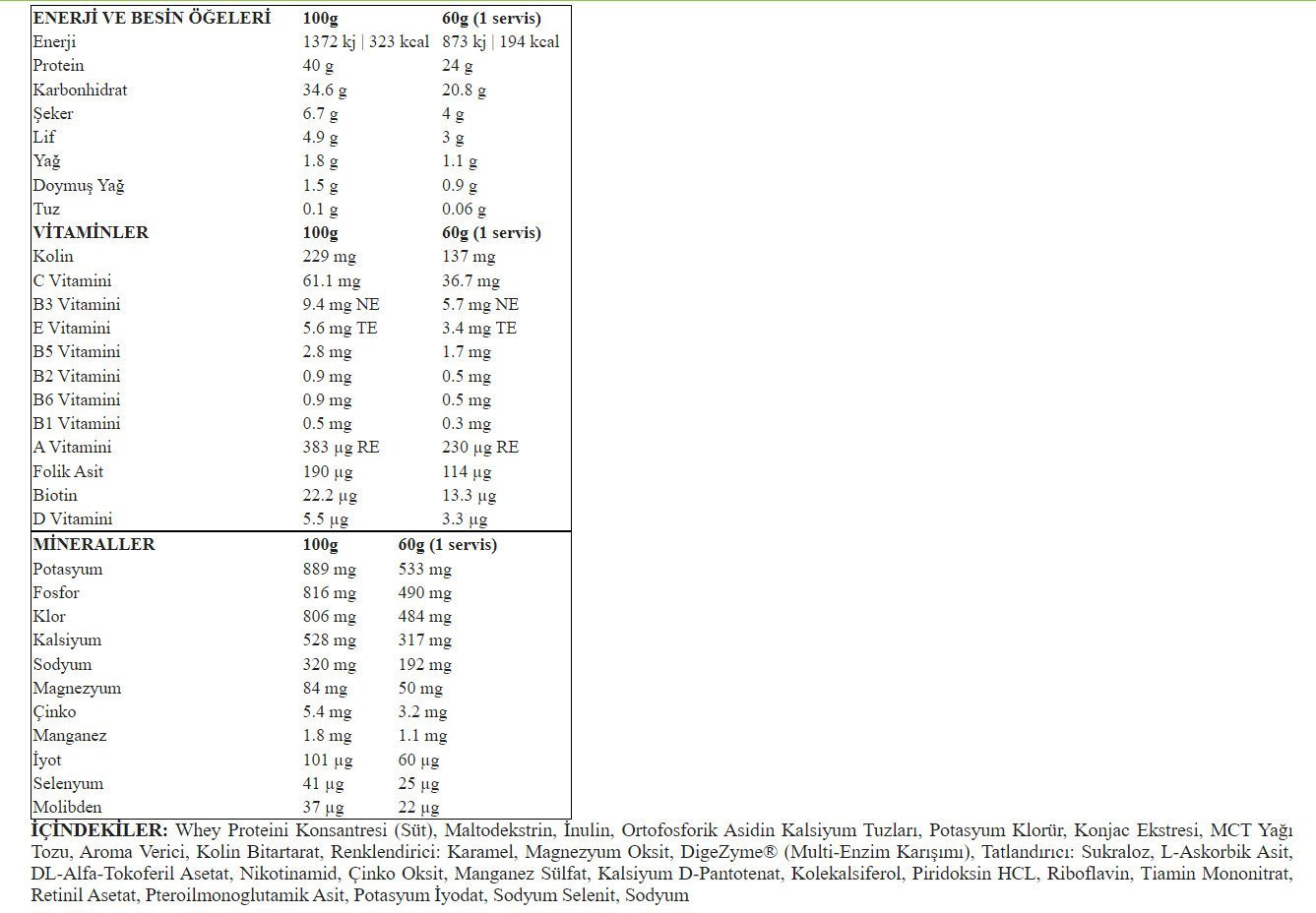 İçeriğinde ana protein kaynağı olarak Whey Protein Konsantresi, ana karbonhidrat kaynağı olarak Maltodekstrin kullanılmıştır. Ayrıca, içeriği faydalı bir yağ olan MCT Yağı Tozu, iştahınızı düşürmeye yardımcı Konjac Ekstresi, lif kaynağı İnulin, patentli sindirim enzimi DigeZyme ile zenginleştirilmiştir.